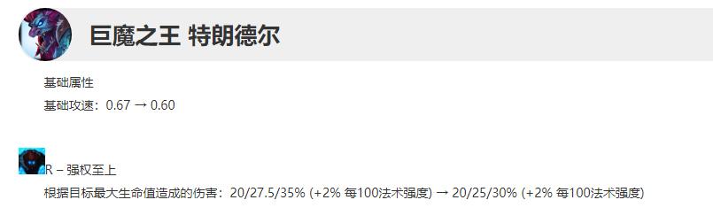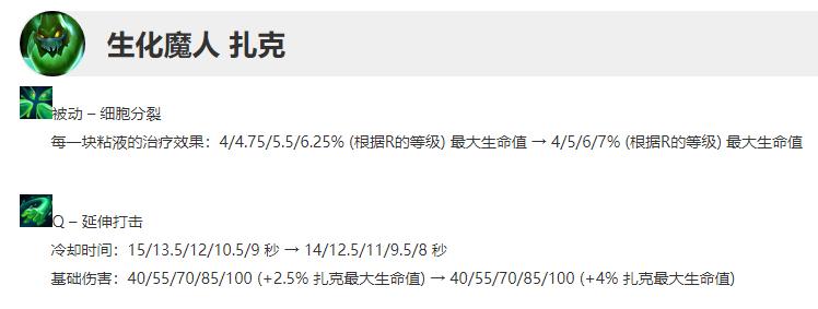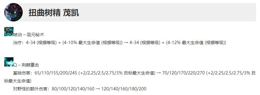 整体削弱了前期的作战能力,加强了梦多的后期能力,让梦多真正意义上的想去哪就去哪。关键点在于R移除了攻击力加成,E改成根据最大生命值获得额外攻击力,满级收益为4.5,按目前坦克整体最大生命值5000来算,光E就提供了225点攻击力,收益非常可观。按中期3000点生命值也有135点攻击力加成,稳定了梦多的攻击力收益,开R后就不再需要惦记攻击力加成去强行开打来不浪费攻击力收益,这样一改让梦多有了更加直观的攻击力收益,加上必出的巨九,伤害能力大大加强。