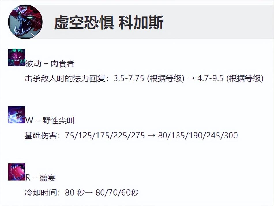 基础蓝量提升,成长蓝量提升,不再那么缺蓝,出门装可以放弃多兰戒带其他装备。Q基础伤害增加10点,提升了下限伤害,小加强。