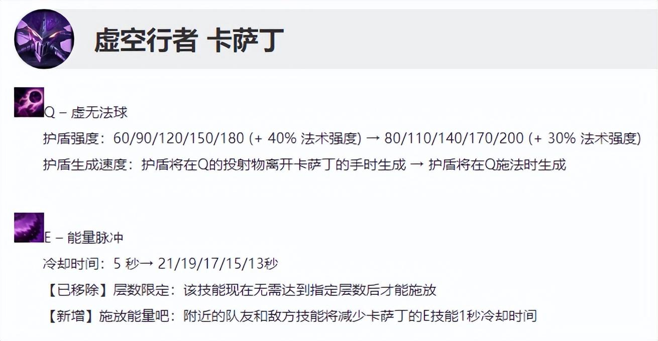 Q挡魔伤更快,E不再需要叠层数,CD转好立马可以使用,虽然CD增加,但是变得更加主动,附近队友和敌人每释放一个技能都会减少1秒CD,使用更方便,可以多蹲草丛秒人了,不再顾及E的层数。