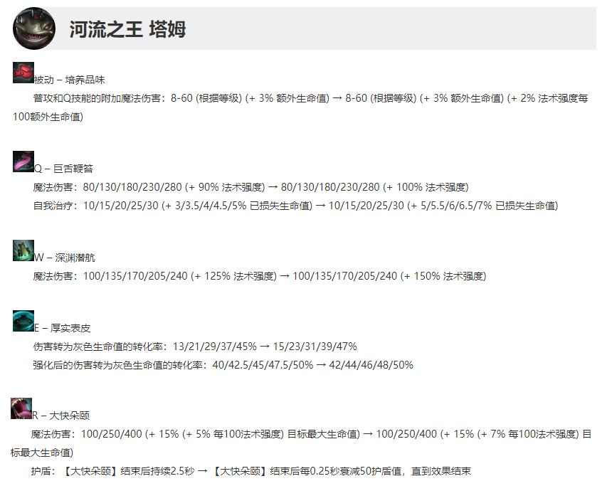 除了E以外全技能法强收益都获得提升,首件小面具的收益将有大幅度收益,让塔姆成为一个强力的AP法坦,但是目前上单环境都是各种吸血鬼,剑姬剑魔青钢影这种会出九头蛇的英雄,塔姆都不好打这类英雄,倒是辅助是直接起飞,塞纳塔姆可以安排安排。