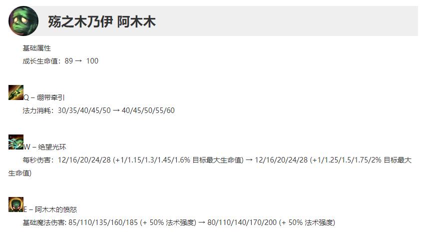满级多187点,Q蓝耗增加10点,W每秒目标最大生命值提升,E基础伤害3级后提升,整体算调整,前三级属于削弱,中后期属于增强。但中后期这点伤害不是关键,如何过渡前期才是阿木木的主要考虑点,这样一改估计玩得玩家会更少。