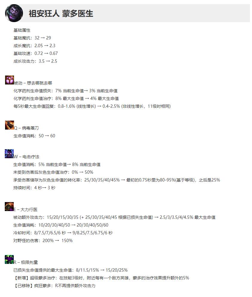 蒙多和泽丽的改动较大,后续可多留意这两个英雄的强度变化。