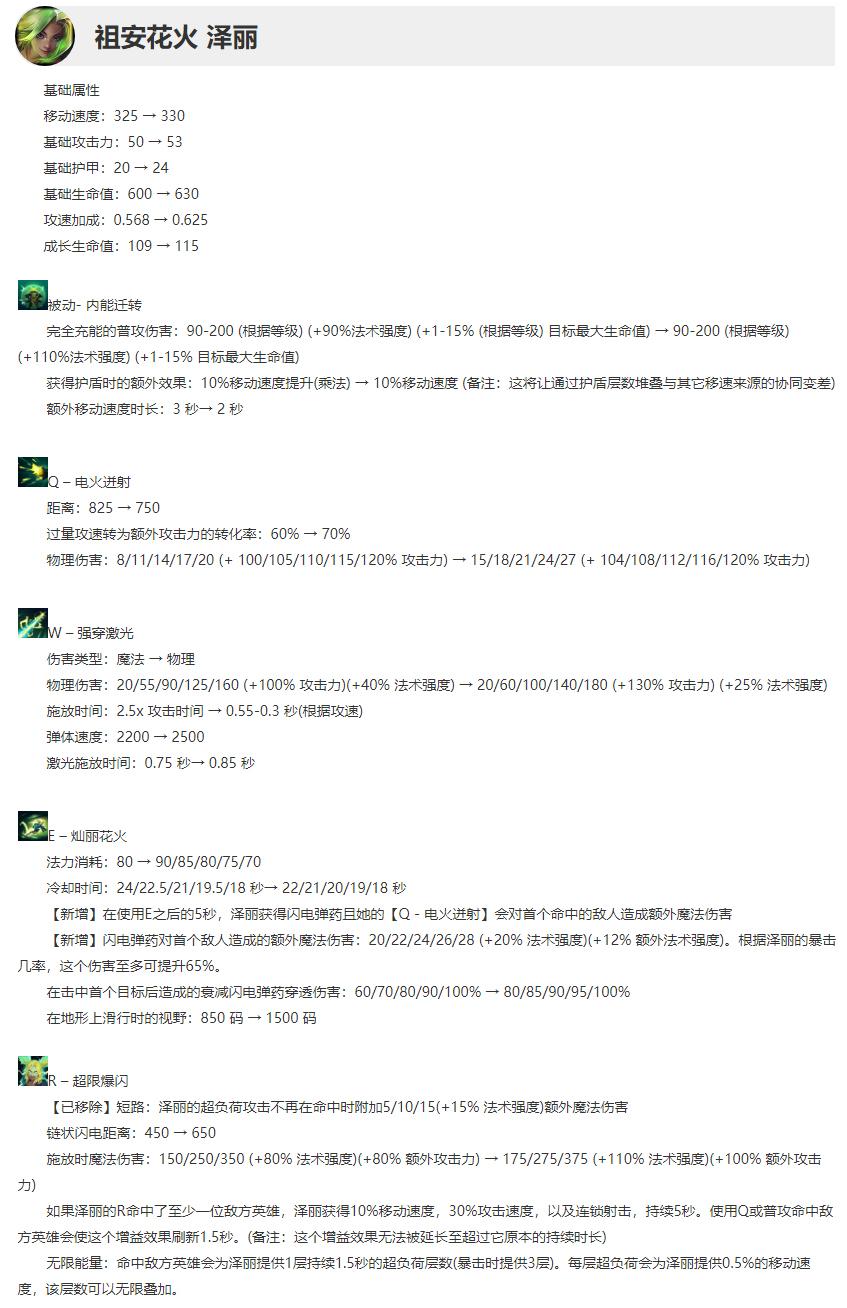 泽丽大改动,基础属性提升,被动法强收益提升,Q攻击力转化率提升,基础伤害提升。W改成物理伤害,基础伤害提升,攻击力收益提升30%,法强收益下降15%,弹道速度降低,释放时间前期削弱,后期提升。E新增闪电弹,对首个敌人造成额外魔法伤害,可根据暴击几率提升,最多65%。R移除命中后的附加魔法伤害,提升爆发时的魔法伤害。整体大加强,下路估计又是泽丽天下。