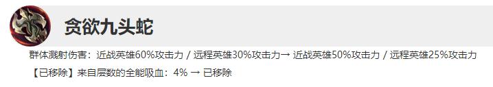 设计师居然觉得九头蛇强是因为全能吸血的额外增加过于强大,只要移除就能解决九头蛇过强的问题,我只能说设计师是真的不玩游戏。贪欲九头蛇是强在高额攻击力收益,和溅射伤害不削减,那需要叠加的全能吸血就是个白送的属性,移除了影响不过微乎其微。降低了溅射伤害但是范围的溅射伤害一天不改,那九头蛇就一直是超模装备,这削得是个√8,该出的还是往死里出。