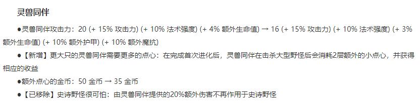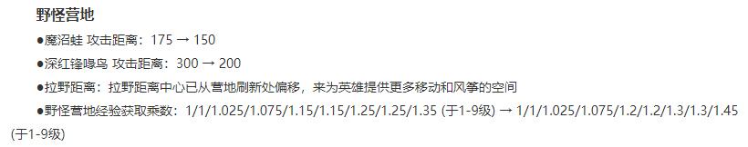 降低灵兽的伤害,新增额外双抗收益提升伤害,额外点心金币提供降低15,魔沼蛙和F6攻击距离降低,方便风筝野怪,刷野不那么伤。同时野怪中期经验收益提升,加快中期刷野经验收益。