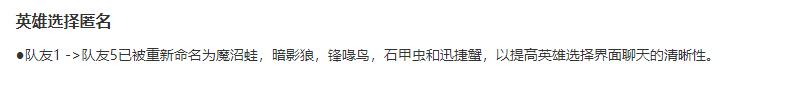 预选英雄的时候从队友1到队友5变成了魔沼蛙、暗影狼这些野怪英雄。聊天框伤:大家好,我是练习时长两年半的魔沼蛙???直接改成队友显示名字不就完事了,整这些花里胡哨的。
