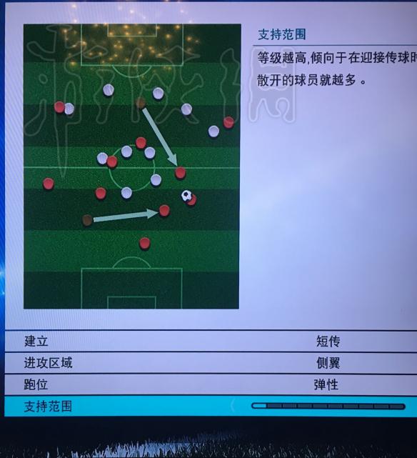当然光是横向拉开阵型,并不足以发挥这个阵型的攻击力。所以接下来说主打边路时的另一项设置——侧翼交替。因为有2中锋,所以任何一边有中锋拉边,都可以保证中路至少有一个头球接应点,这也是为什么前面要设置双中锋,而不是中锋+影锋的原因。侧翼交替形成的结果就是,在边路经常可以形成1个边后卫+1个边前卫+1个拉边前锋甚至+1个中前卫的配置,这样一来反复倒脚,总能够找到比较好的传中机会。因为我试下来,强行传中的效果很不好,还不如不传。