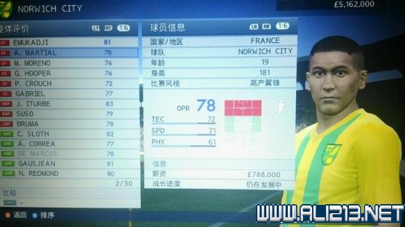 第一个是法国的年轻前锋A.MARTIAL,可以打锋线任何位置,并且实际在场上的实力比他的数值强,跑位可以,并且有速度,射门的话感觉比很多射门八十几的还要好。