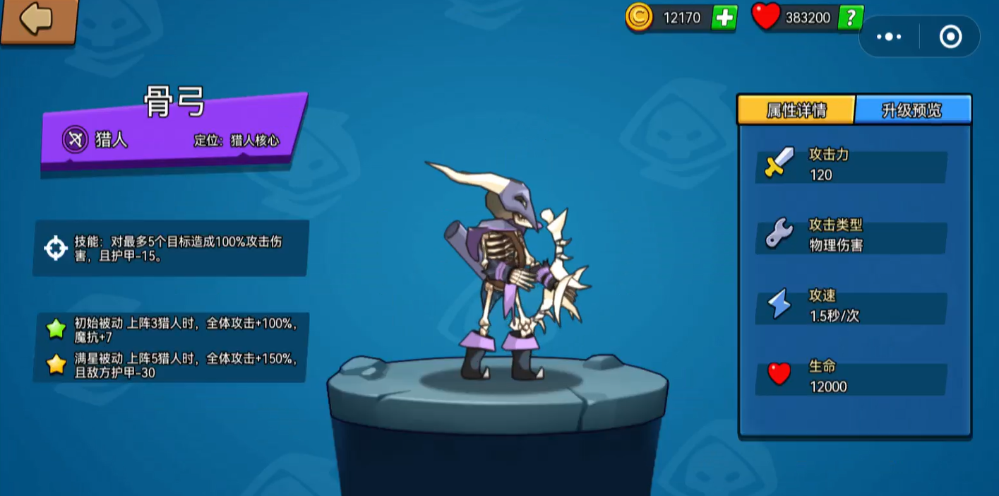 这个卡牌的优势就在于他的被动,只要上阵的猎人超过3个,就会增加全体上阵英雄100%的攻击力,并且还能够提升魔抗。如果将他升到满级的话,上阵有5个猎人,全体攻击力是加150%,并且能够减少敌方英雄的护甲值,减少30点。