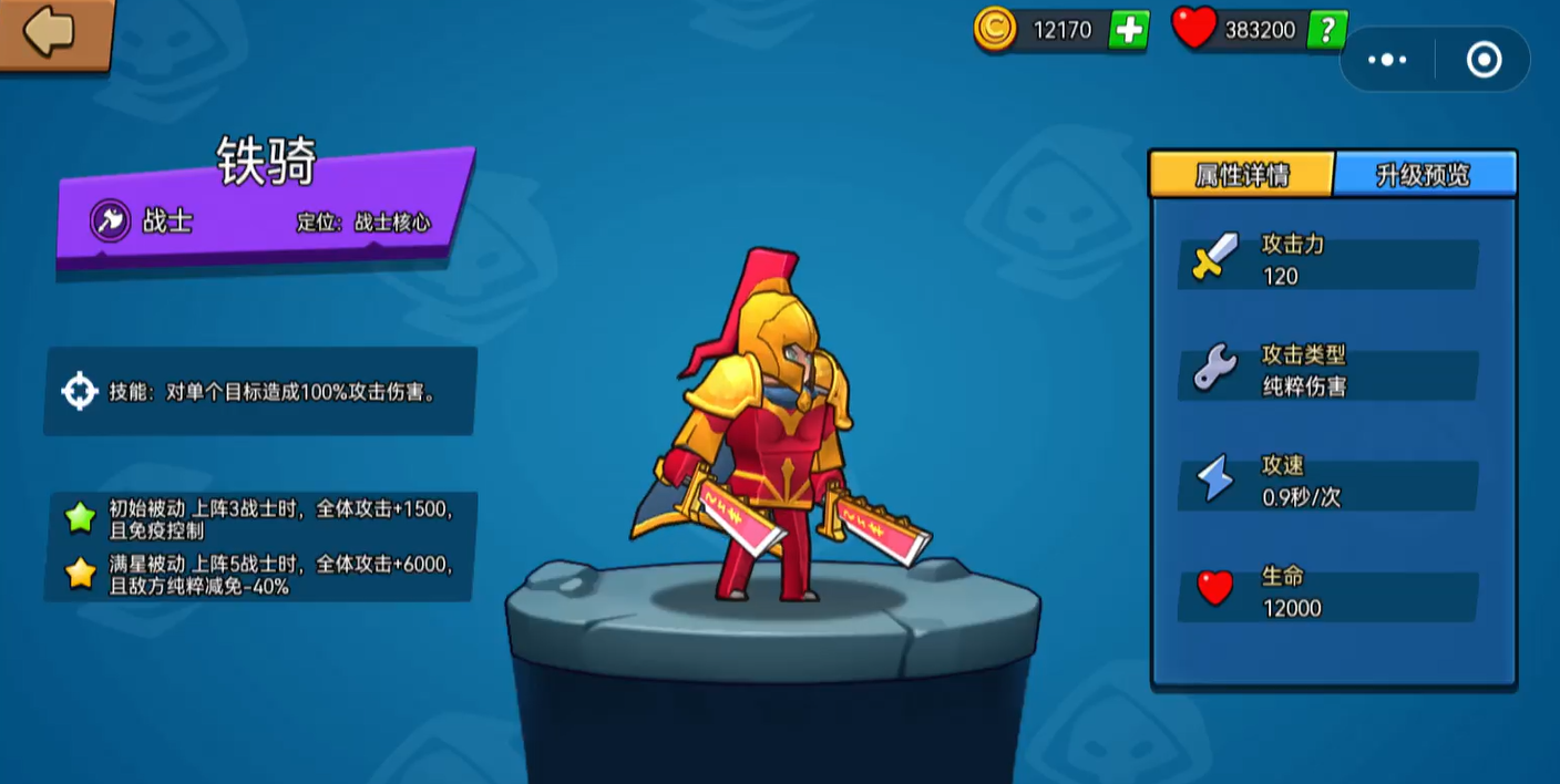 当铁骑升到满星的时候,如果上阵的阵容中有5个战士,那么能够为全体增加6000点攻击,并且能够减免敌方英雄40%的伤害值。