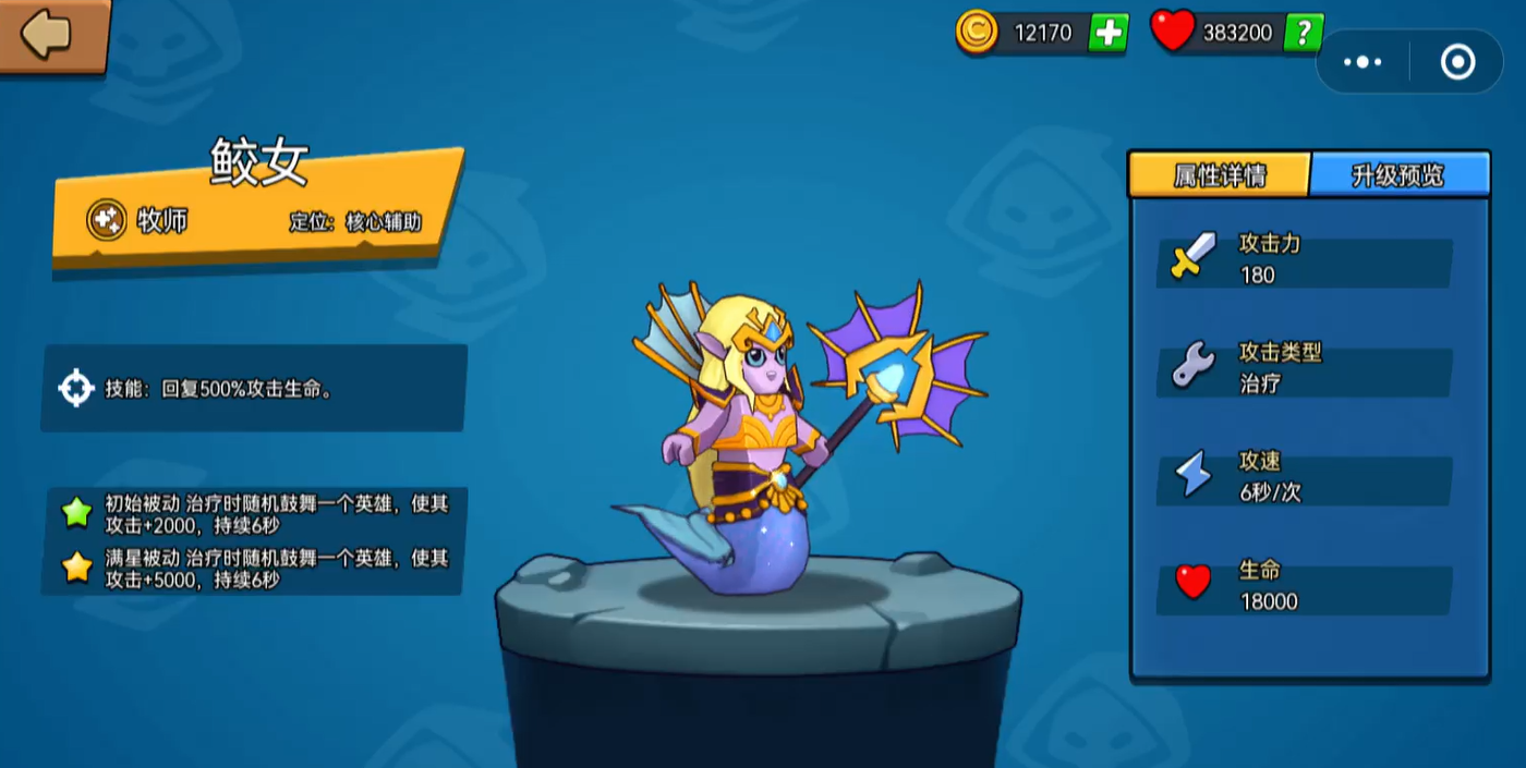 这个牧师除了能够回复500%的攻击生命,在初级的时候,能够随机为一个队友增加2000攻击,持续时间长达6秒。