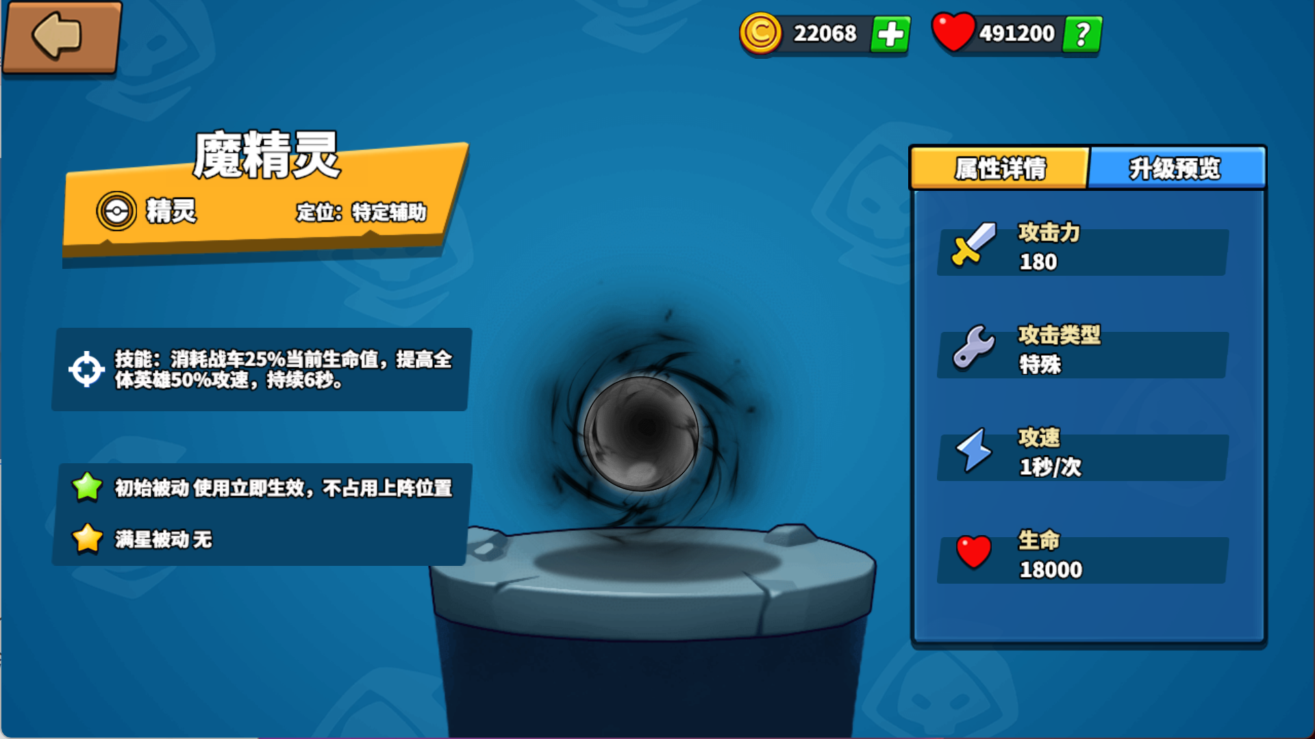 魔精灵的主要作用是能够在短时间内提升全体角色的攻击速度,这个是在基地受到威胁的情况下,可以这么使用的,因为这个卡牌有一个弊端是会消耗战车当前25%的生命值。