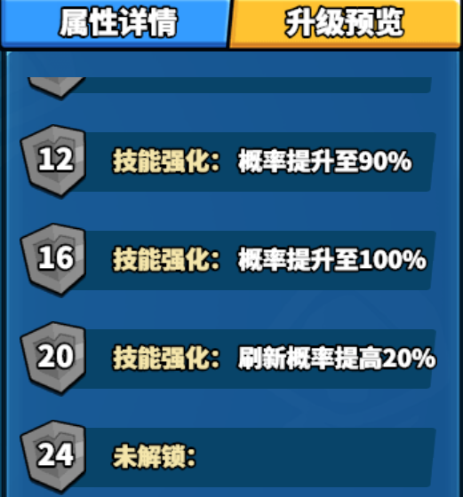那么这个卡牌随着等级提升,技能会得到强化,那么技能出现的概率也会随之提升。比如说强化等级到了4级,概率会从60%提升到70%,当等级提升到了12级,概率会提升到90%,等级到了16级,概率能够提升100%。