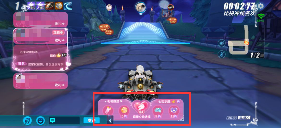 首先送出道具的前提是需要有足够的水晶,水晶获取是需要前期小哥哥们的努力,名次越靠前获得的水晶越多,所以在这里小编要给各位小姐姐们提醒一下,你们前期给队友打call也是至关重要的,千万不要觉得麻烦,打的call越多队友获得的氮气奖励也越多。获得水晶也更多,这样后面小哥哥给你们刷道具的时候你们也能更轻松的跑图。Call打的好,队友直接道具给你抬到终点~