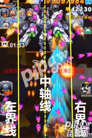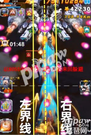 躲避方法:这个是接着第一轮子弹后的子弹,仍然是站在BOSS中轴线最下方,沿着下图左、右界线轻微移动即可。记住,是轻微左右移动,如果移动跨度大,这个子弹就会乱。