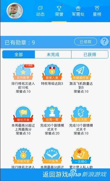 任务模式中的私人助手点击后,就能进入荣誉界面,包括名列前茅、登堂入室、收藏爱好者、继往开来、技高一筹、勇往无前等十四项荣誉。荣誉榜每周更新一次,记录着一周的荣誉,不用担心自己的努力没人关注,其实飞机一直记载着你的点点努力和贡献呢。