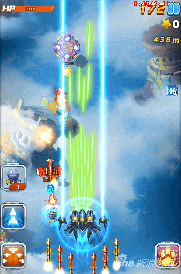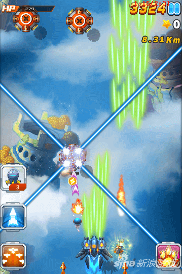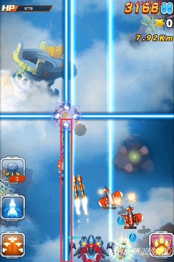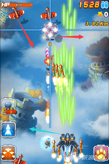因为还有boss的存在,所以技能尽量放给boss。那么在前期我们遇到危险怎么办呢?前期尽量用核弹清除危险,但是核弹只有三枚,所以核弹要用在最关键的地方。像图中这种情况,三个激光装置一起出现。而且后期还会出现自杀式飞机,这时候使用核弹是再好不过了。