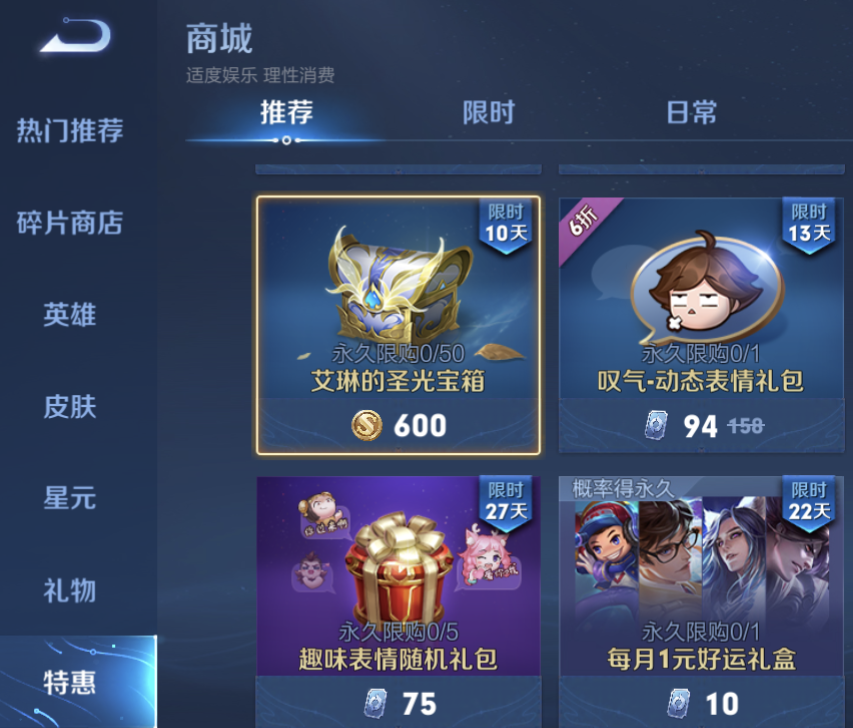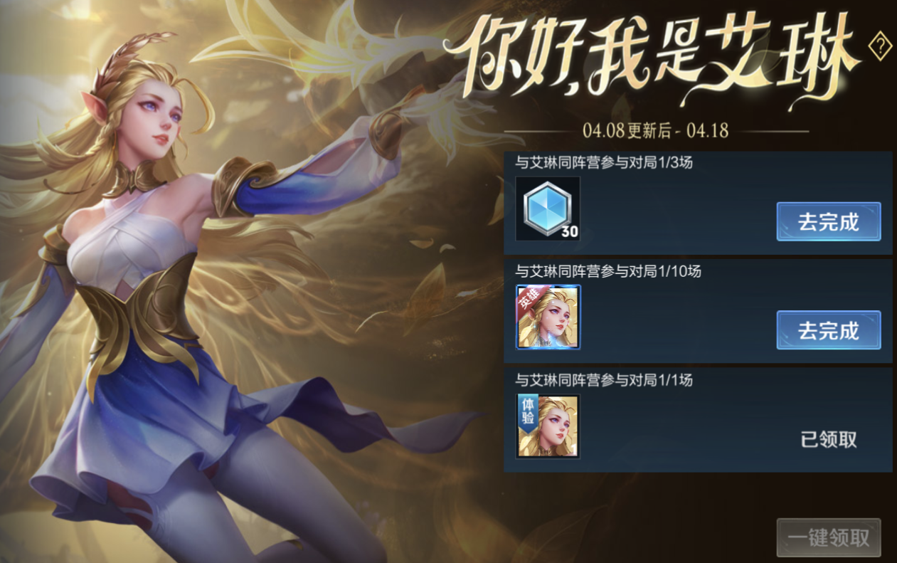 目前已经出来限时任务了,只要与艾琳同阵营参与10局5V5匹配,或者是排位以及娱乐模式,甚至是5V5人机,我建议你玩快速模式青铜级别的人机,这个通关难度非常低,基本上3分钟就能结束一局。