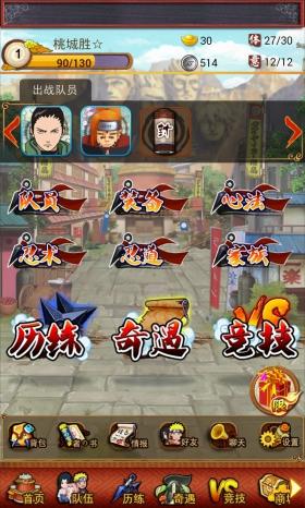 《口袋忍者》的游戏操作还是十分简单的,只需要在历练前做好排兵布阵的准备即可,然后点击“战”字就会进入战斗画面,战斗画面是自动的,所以十分休闲。游戏中玩家可以通过点击游戏最下方的首页为自己的角色装备道具和忍术,从而提高战斗力。