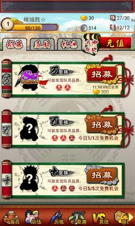 玩家可以通过点击商城获得新的战斗人员。游戏在一开始的时候会送玩家一个A级的角色,随后玩家在进入2J和4J后都可解开一个空位,这样就可以让新的队员添加进来方便战斗。游戏在招募新队员的时候设有三个等级:“万里挑一”可开出S/A等级的队员,3天可免费招募一次。“百里挑一”可开出S/A/B等级的队员,1天可免费招募一次。“十里挑一”可开出A/B/C等级的队员,10分钟可招募5次。11773小编表示好多卡牌队员都没有听说过~
