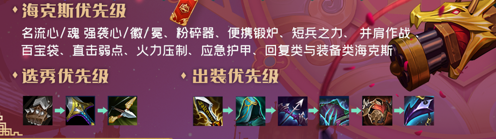 其他可考虑直击弱点、火力压制、应急护甲、回复类与装备类海克斯都可。