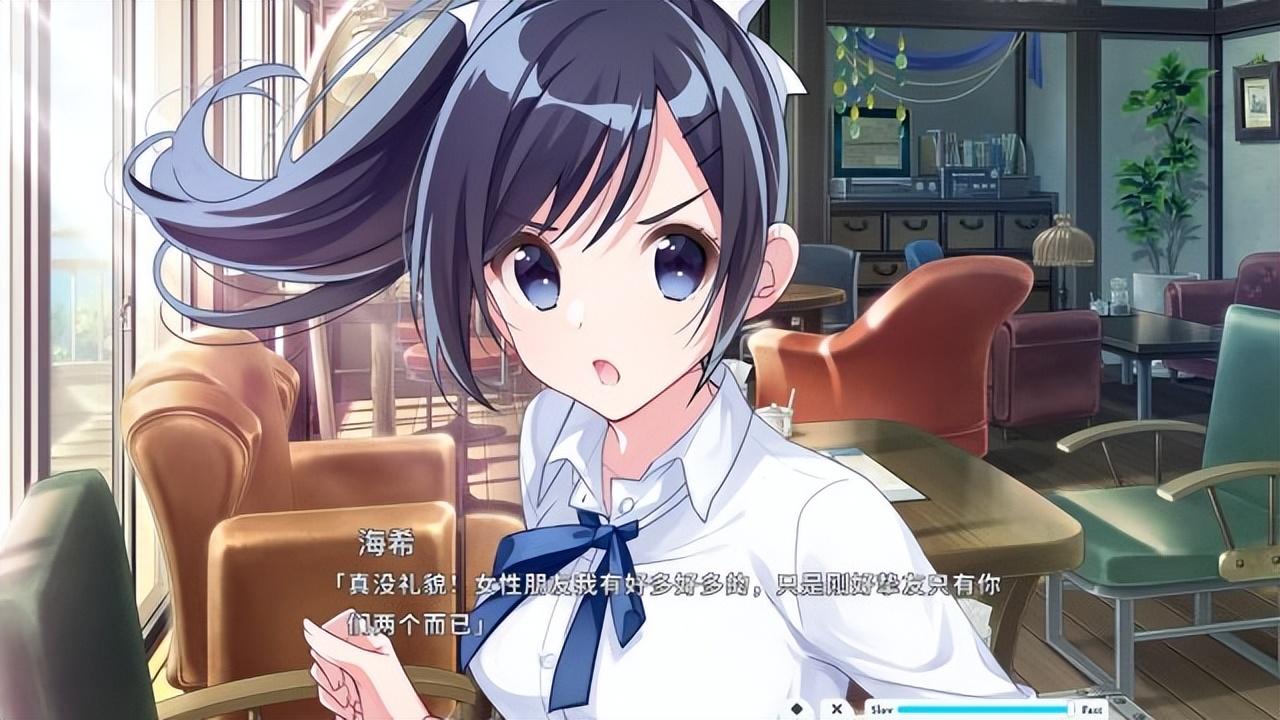 不过游戏整体在美术上的表现还是非常让人满意的,尤其是场景绘画比如咖啡店很细致,有种京阿尼的感觉。游戏的制作精良还体现在一些小细节,比如做了人物站位不同的声道变化(但似乎不太明显,我没听出来)。不过也有一些小问题就是除了主角五人组剩下的全部连头像都没有,包括了海希父亲、圆音经纪人这种其实戏份还不少的角色。
