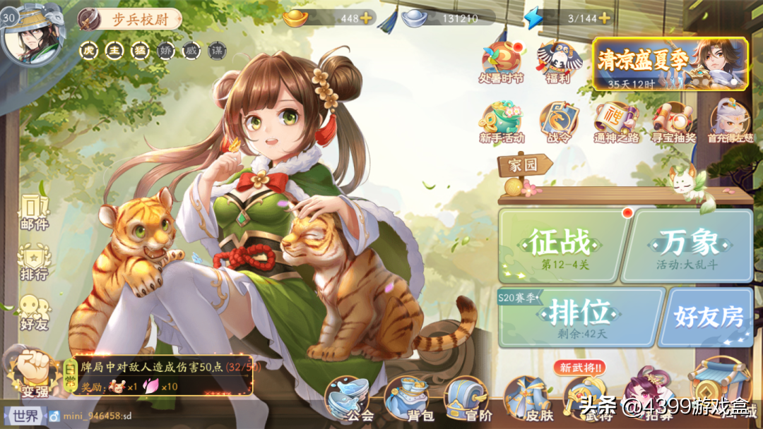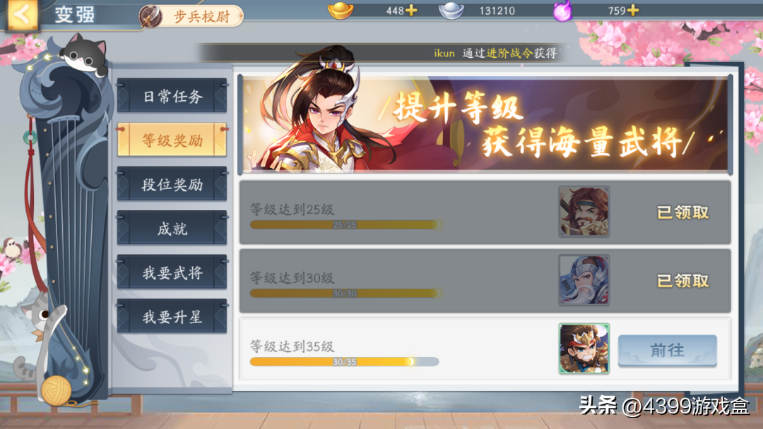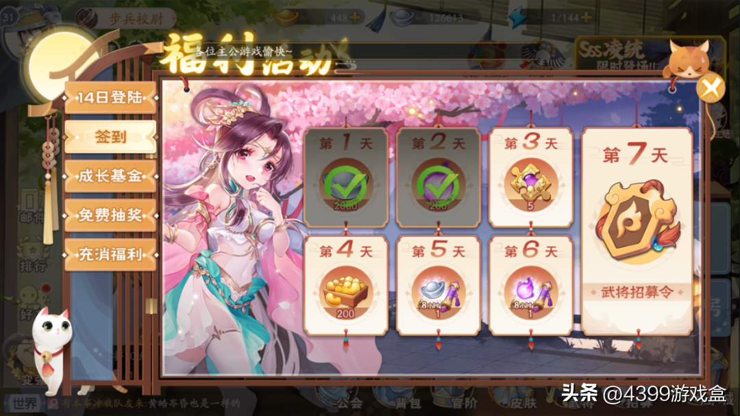 3.每日签到、完成活动/每日任务、提升等级后均有武将和招募令等奖励;