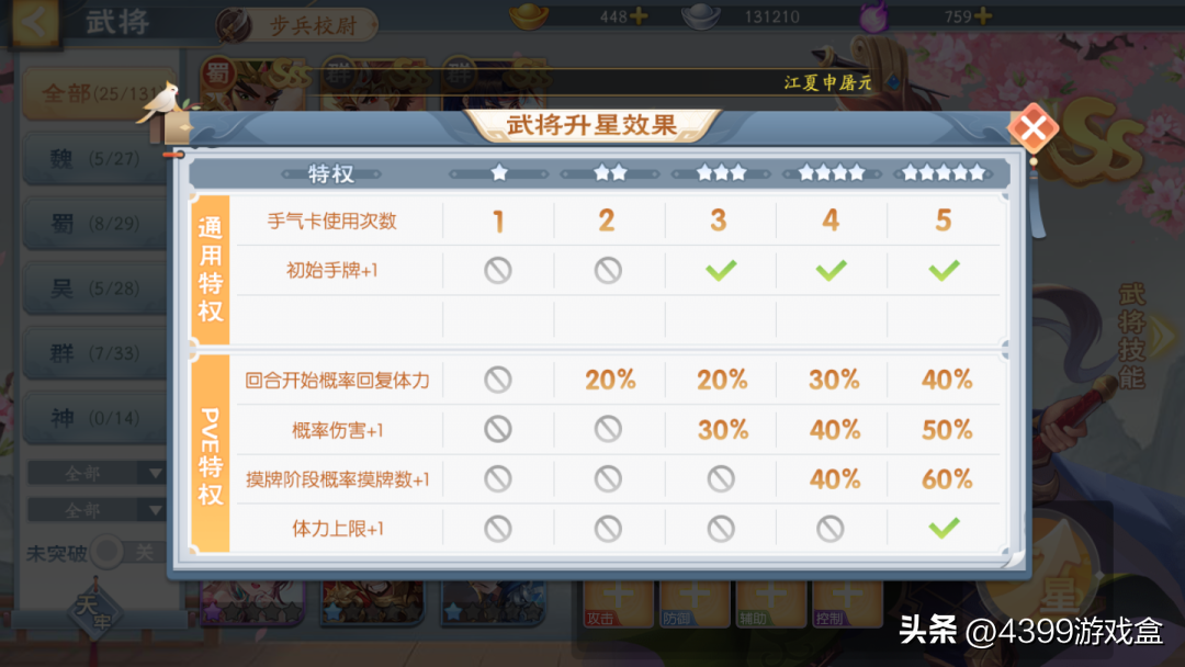 武将在提升星级的过程中也不会像以前一样只增加攻击特效,而是有实质性的能力加成,如“回合开始有概率回复体力”、“有概率伤害+1”、“初始手牌+1”、“体力上限+1”等强力特效。