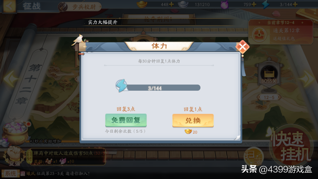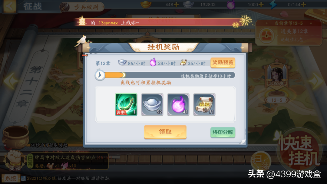 闯关模式有每小时挂机奖励,奖励数量会随着玩家推图的进度增加。