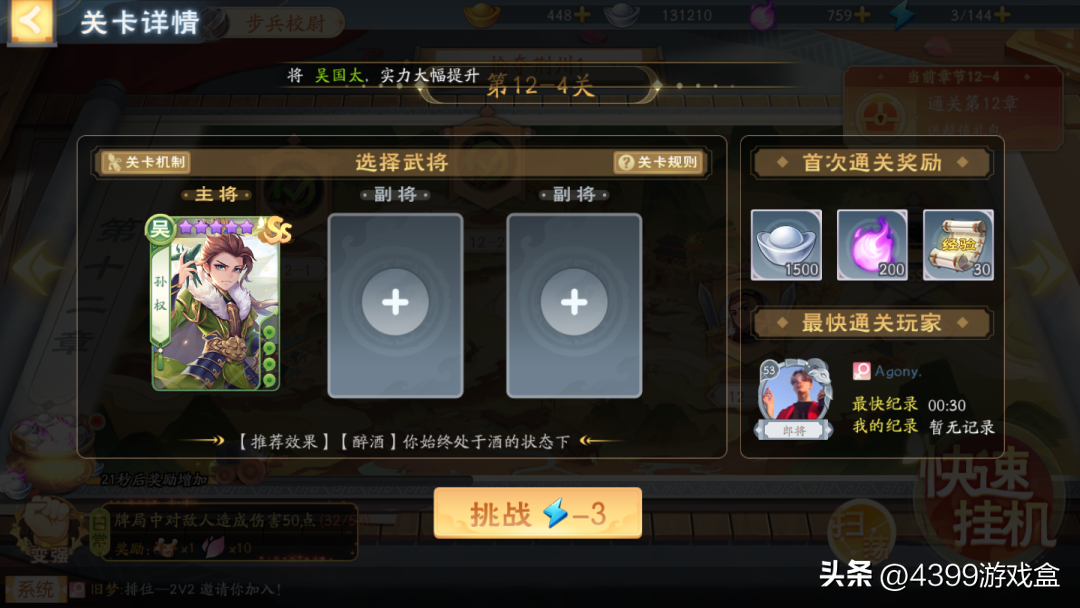攻略PVE关卡时会有体力限制,武将仅能选玩家目前已拥有的武将。