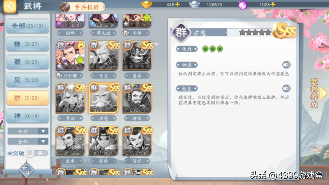 比如说孙权、刘备等武将直接取消了界限突破,本身就自带突破后的技能;而上面我们刚刚提到的左慈则是将获得武将牌的技能改成了“受到伤害后观看牌堆顶三张牌选不同花色获取”,以及“可以改自己的判定牌”。