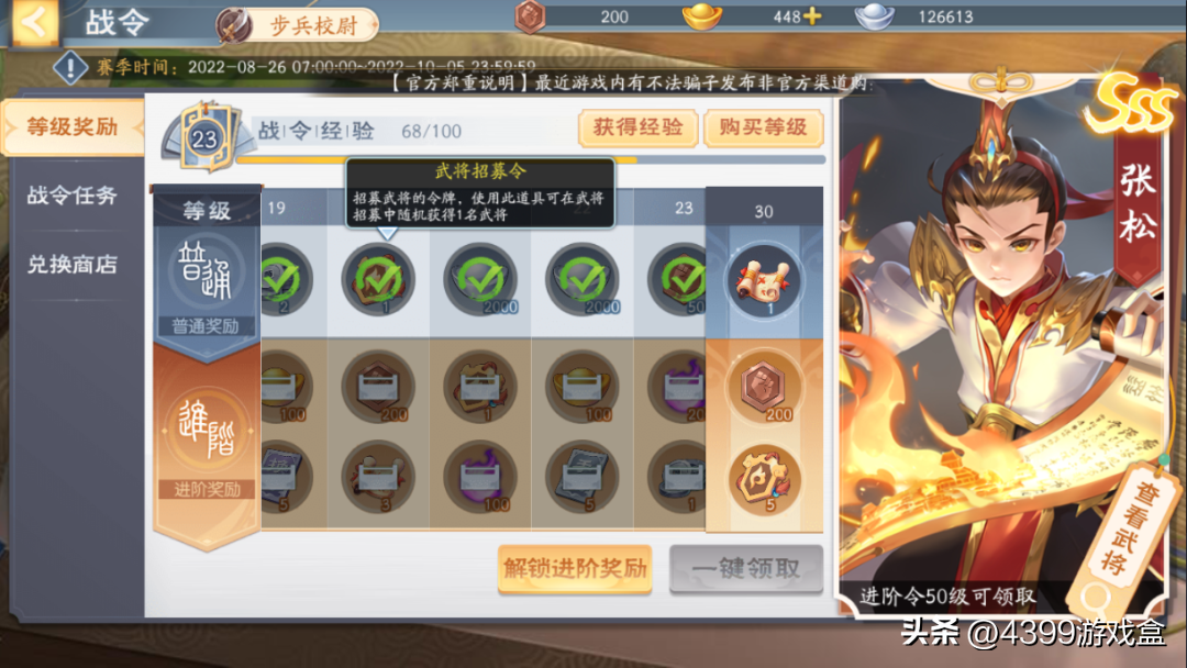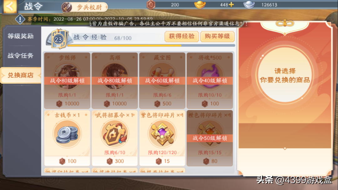 2.在战令兑换商店里,每300战令币可兑换一个招募令,提升战令等级后还可以用10000战令币直接兑换步练师和高顺;