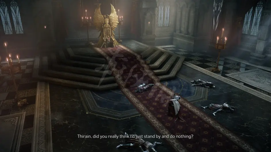 光明骑士正在与篡位者对峙,篡位者与光明骑士过了几招,随后篡位者与你交谈,希望你能加入他的阵营。