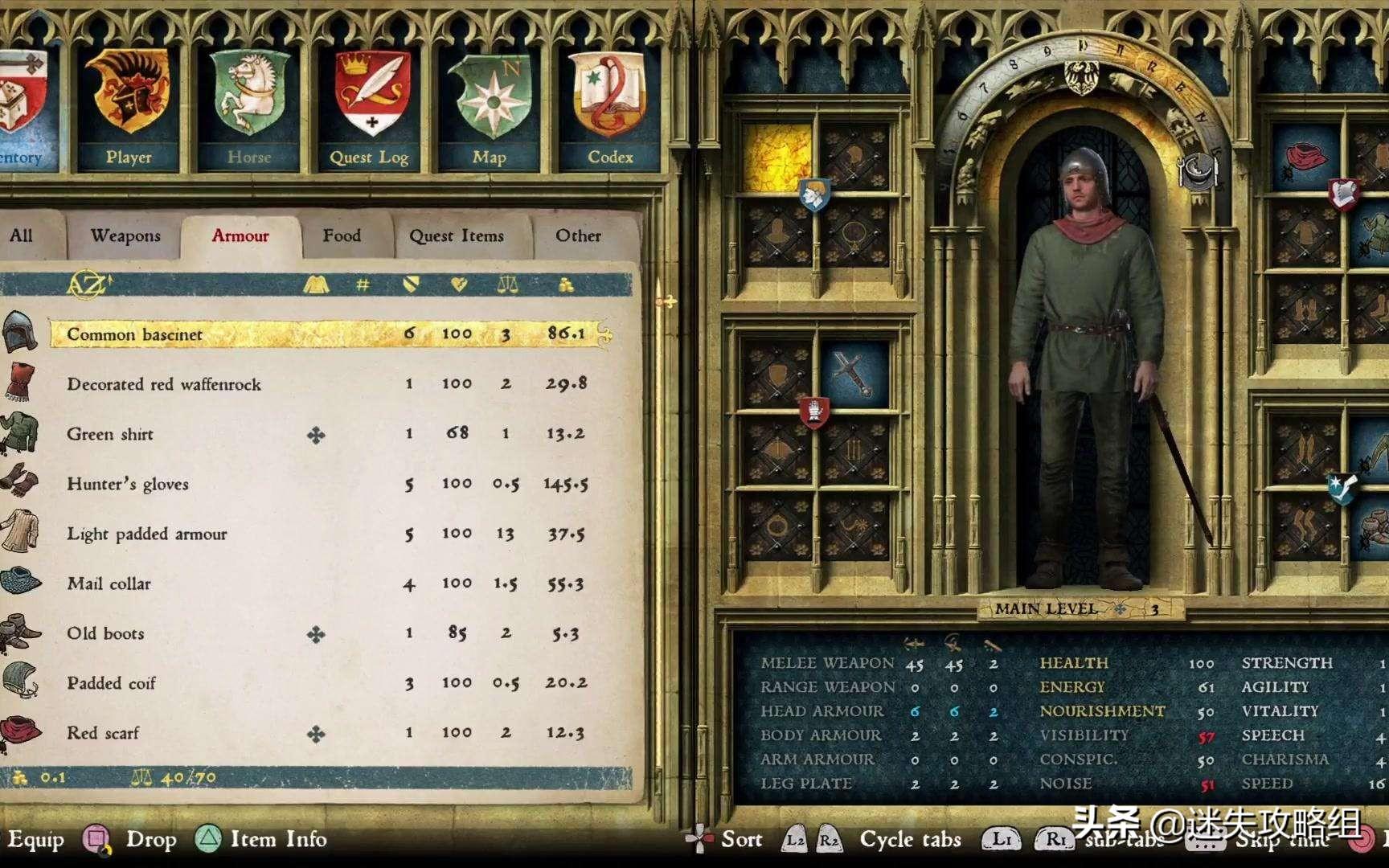 中世纪骑士们穿戴装备的麻烦程度,可以从这款游戏里看出一些端倪:玩家的上装栏有6个空格,下装栏有4格,头部4格,饰品和武器也有6格。玩家搭配装备,就得像“包粽子”一样,里面几层、外面几层;而且还得注意重量、显眼度、噪音这些会影响玩家其他属性的数值。既不能一味顾着外观的美观度,也不能只注重装备的属性加成。更不用说这些“破铜烂铁”还有耐久度,需要玩家去修理。