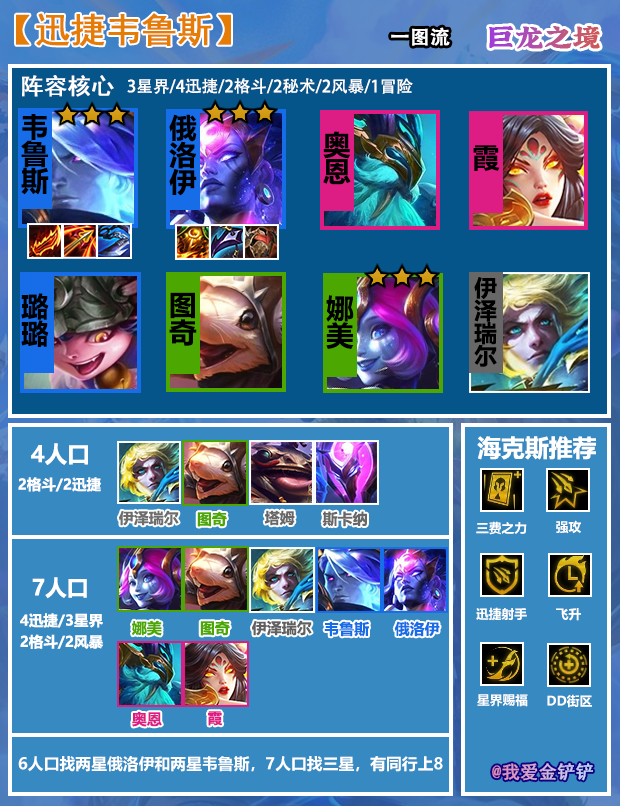7人口,找三星“韦鲁斯”和三星“俄洛伊”,优先组【4迅捷射手】。搜出三星之后,“璐璐”换下“娜美”,等到8人口再上回去。