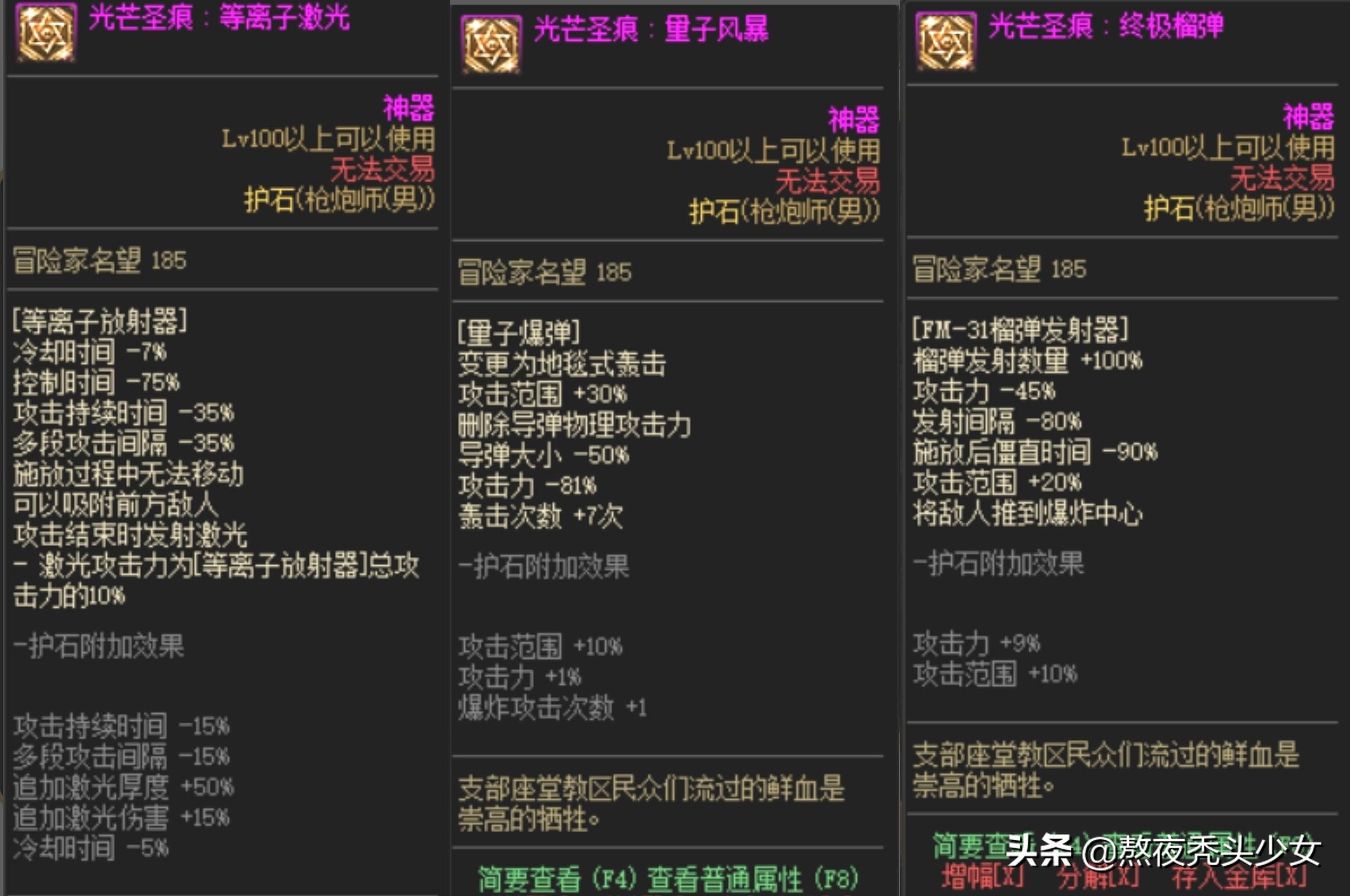 对于剩下的三件护石(榴弹炮、量子爆弹、等离子射线)可以直接pass掉。首先,这三件护石都会减少攻击力,爆发伤害太低;其次护石变更了技能形态,比如量子变成了七发、等离子释放时不能移动等,作为追求极限爆发的玩家很难接受。