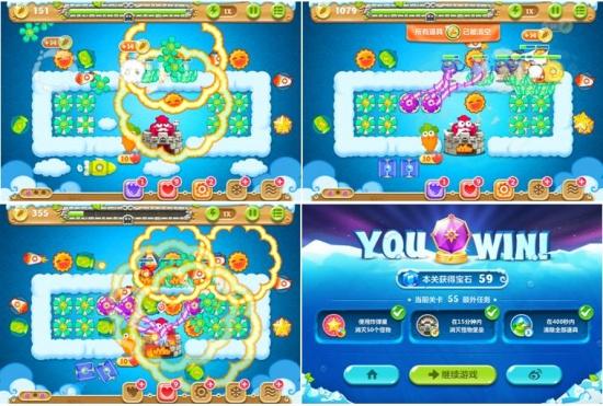 第55关额外任务有(1)使用炸弹星消灭50个怪物;(2)在15分钟内消灭怪物堡垒;(3)在400秒内清除全部道具。游戏开始后可以在地图右侧安装一个炸弹星,并升至顶级,用于消灭来袭怪物。在右侧上方气球旁边安装太阳花塔,清除周边道具。