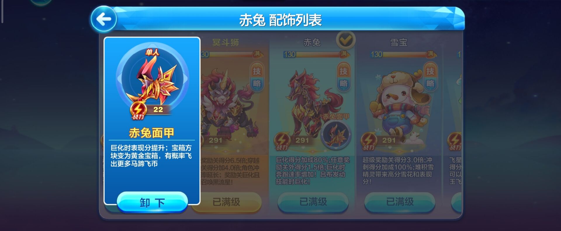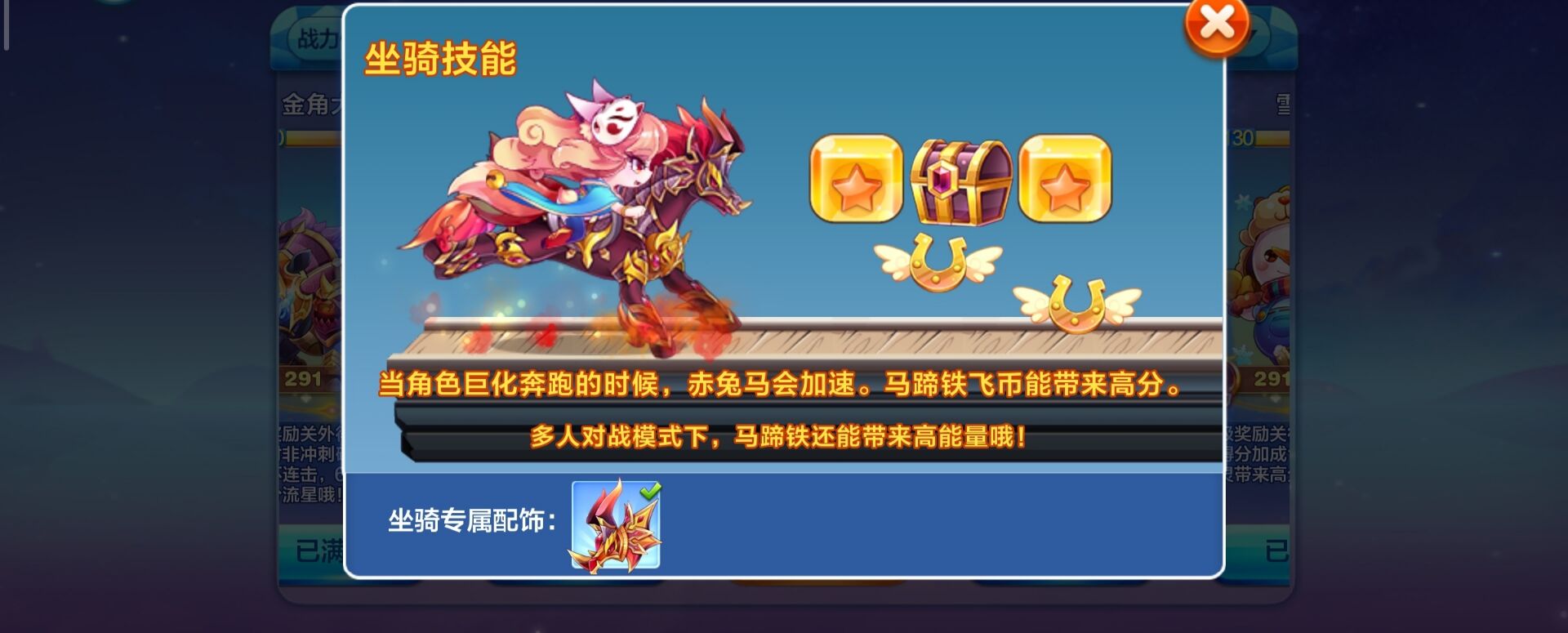 当角色巨化奔跑的时候,赤兔马会加速。马蹄铁飞市能带来高分。