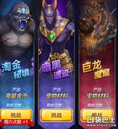 秘境分为:淘金,暗黑和巨龙,对应的产出为金币,宠物材料,宝物材料。 每个秘境根据刷新时间是有4次机会去挑战的哦,产出的数量十分可观,最主要的是不会扣心!不会扣心!不会扣心(小虎泪奔/(ㄒoㄒ)/~~)所以挑战这三个秘境来累计自己的收益是每天的日常哦。