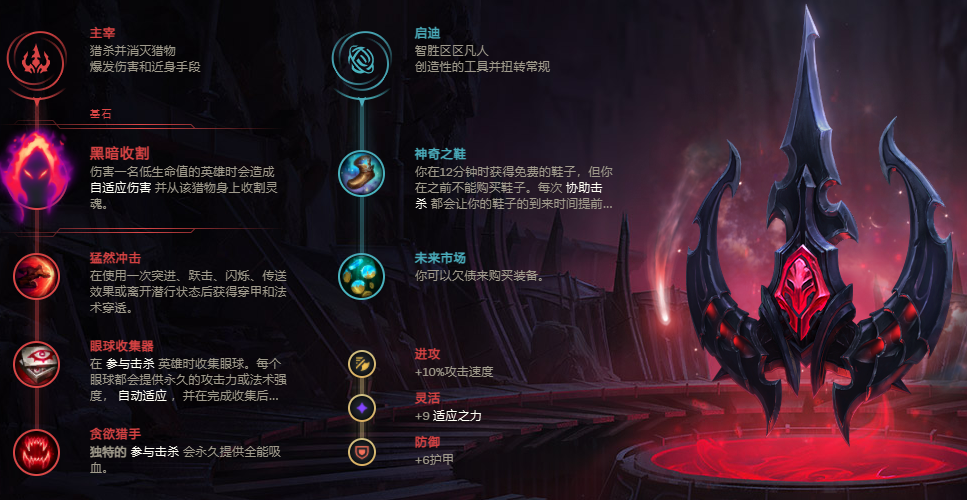 艾克打野的基石符文推荐选择黑暗收割,随后点出猛然冲击、眼球收集器与贪欲猎手,副系则是选择启迪系点出神奇之靴与未来市场。属性方面推荐点出攻速、自适应之力与护甲。