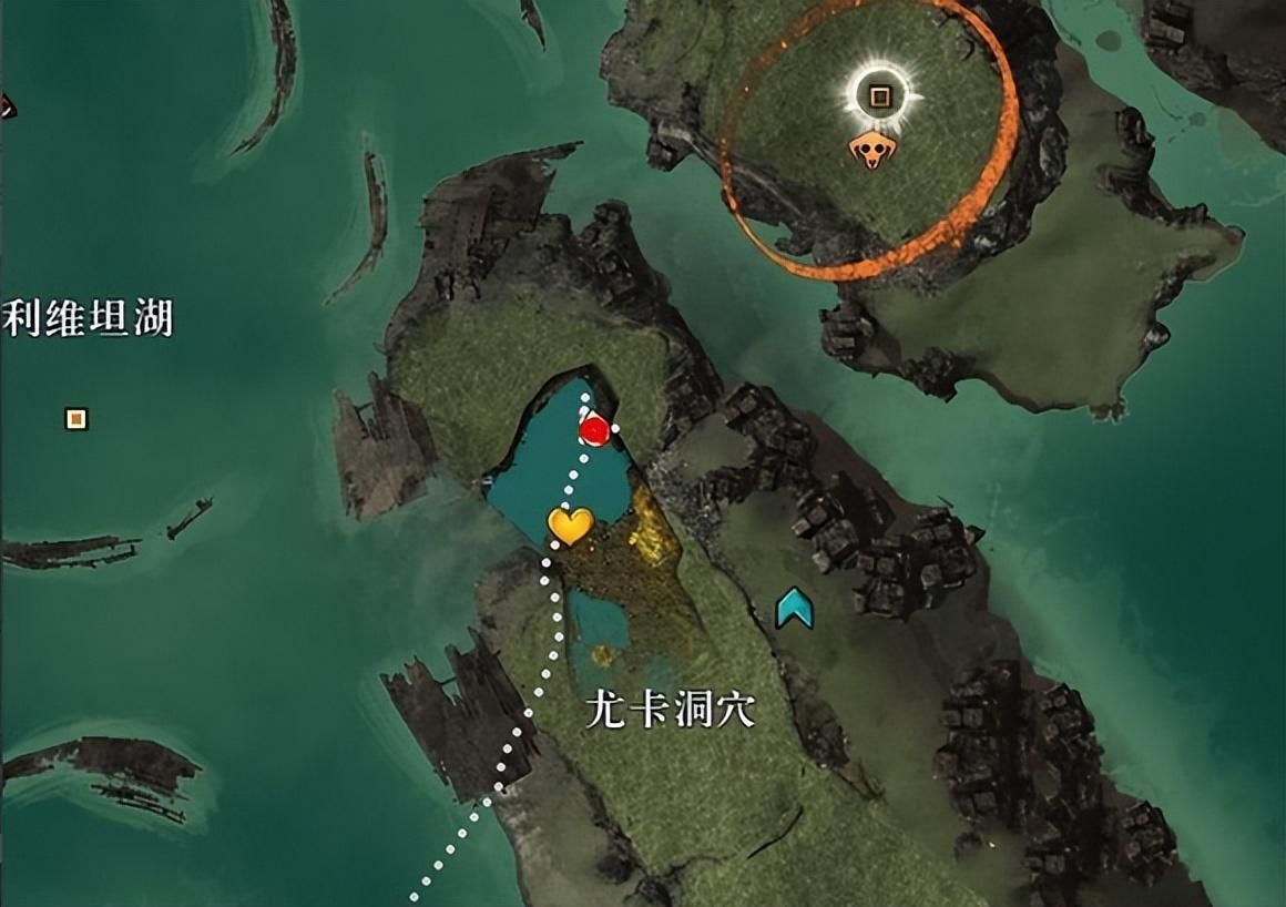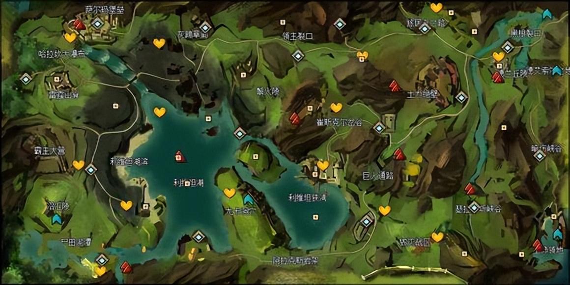 2、从上面的地图可以看出,激战2凯席斯山需要玩家探索的地方基本遍布了地图的各个角落。这张地图总的来说比较友好,没有比较难找的地方。唯一一个比较坑爹的应该是炼金师探索点,搜索的入口在(下图)红点处的水下,往下游会看见个洞口,俩边有黄色树叶挡着顺着洞一直游就能到达搜索点了。