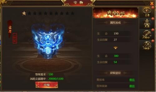 升级需要消耗尘盾精华,主要通过竞技场获得