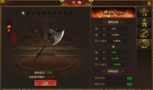 升级需要消耗神斧精华,主要通过捐献任务和野战比奇玩法获取