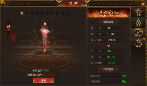 升级需要消耗剑心精华,主要通过除魔任务和日常押镖获取