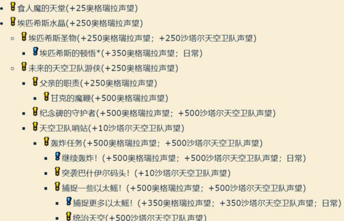 奥格瑞拉声望获取基本上没有太多的隐藏点,基本上都是通过刷怪、NPC任务以及日常任务来获取声望。战斗可能是在冲奥格瑞拉声望能做的最多的事情,友善状态下奥格瑞拉日常任务类型没有太多的变化,只有“埃匹希斯的顿悟”“捕捉更多的以太鳐”“继续轰炸”三个。