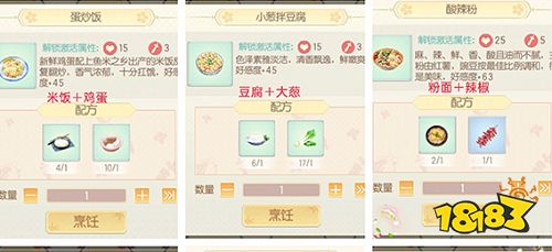 盛世芳华菜谱大全攻略最新2022:小葱拌豆腐45-112:豆腐+葱;番茄豆腐莫45-112:豆腐+番茄;饭团45-112:米饭+水果;番茄面45-112:番茄+面;酱猪头肉63-157:普料+猪肉;八宝粥45-112:米饭+果仁。