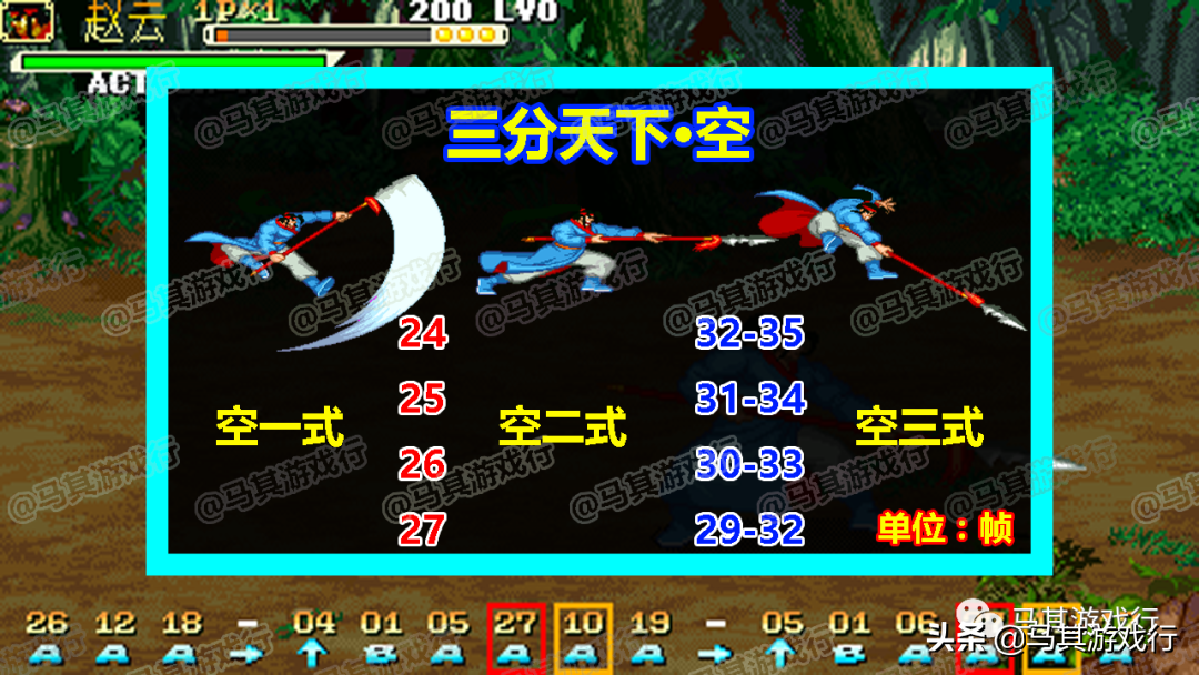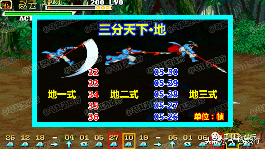 三分天下·地的间隔数据,其理论与空式相同,但时间2的范围很大,一般在时间1有效间隔中连按两次A键,就能直接打出地二式与地三式,最晚也不能超过对应的帧上限。