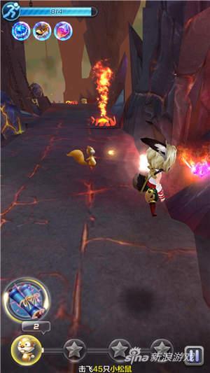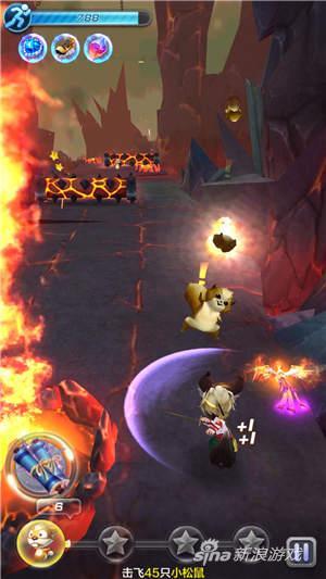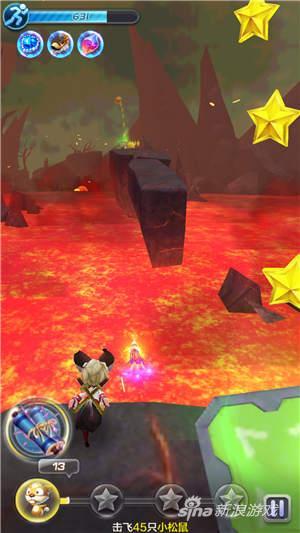 这一关卡我们闯关并没有太大的难度,首先要注意的是开始的喷火的石头坑,玩家要提早做出反应,从边上躲避过去。玩家一定要注意石头坑的位置,在击飞小松鼠的同时不能忘记躲避障碍物哦。