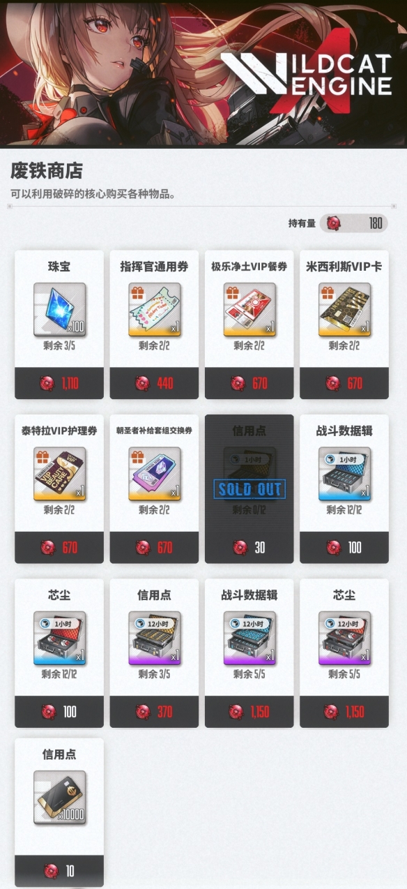 废铁商店中,能兑换的物品包括珠宝、通用礼物、专属礼物、1小时的信用点/战斗数据缉/芯尘、12小时的信用点/战斗数据缉/芯尘、10000信用点。