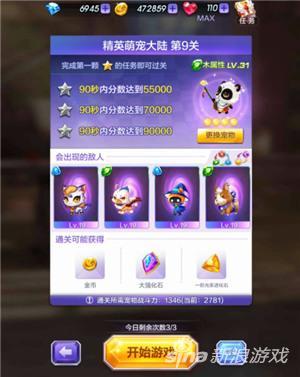 精英萌宠大陆的第9关副本是限时抢分类副本,要大家在规定的时间内达到规定的得分数。建议大家把选配的重点放在角色的选择上来,在角色的选择上要选择过得分能力强身手轻灵矫健的角色,比如疾风少年、魔女娜娜等。同时由于击杀野外宠也可以获得相应的分数,所以携带宠如果选择的好也能吃到不少分,综合属性相克的原理及过关的实际要求,建议大家选择木属性的高攻宠物即可。